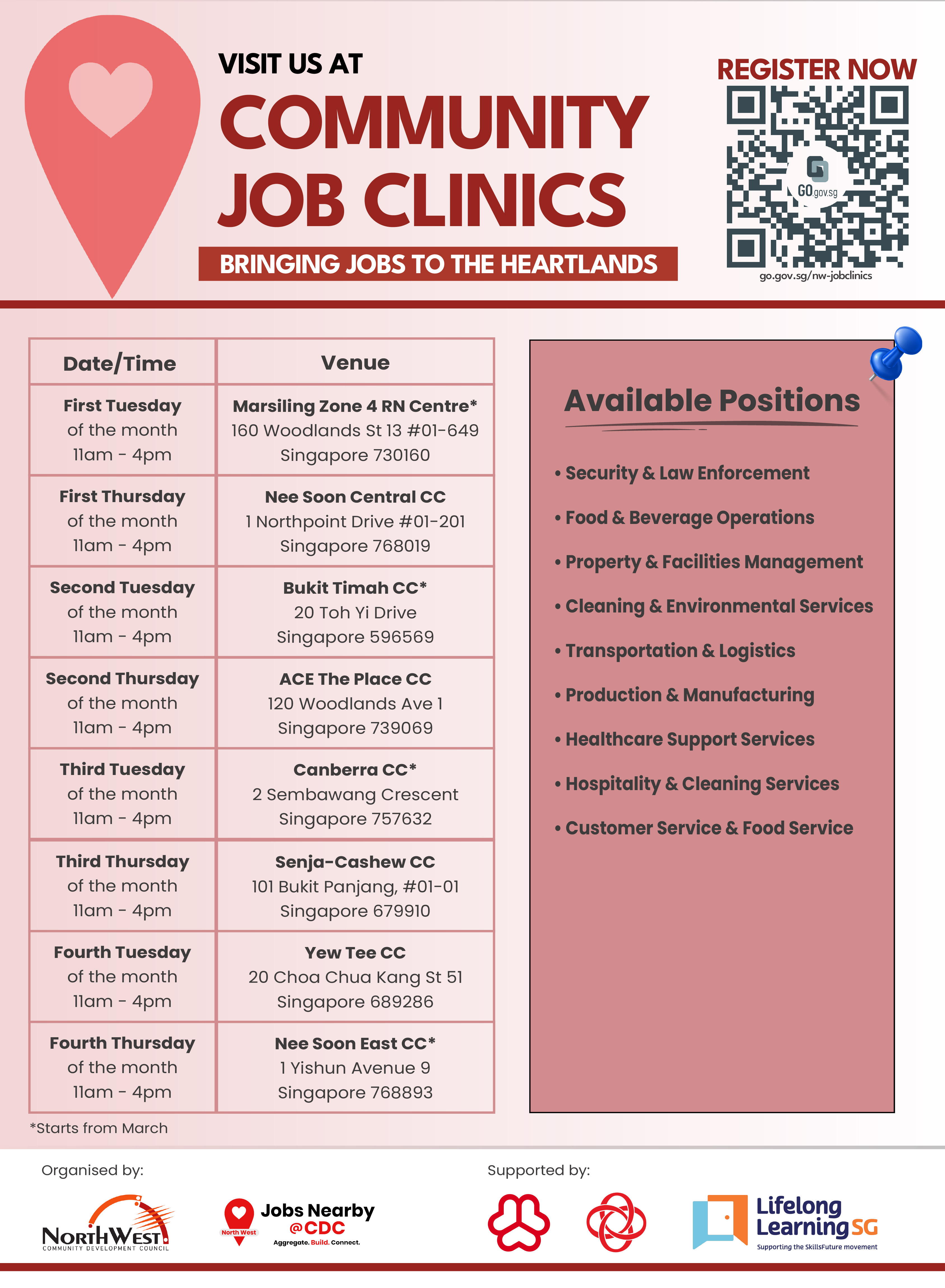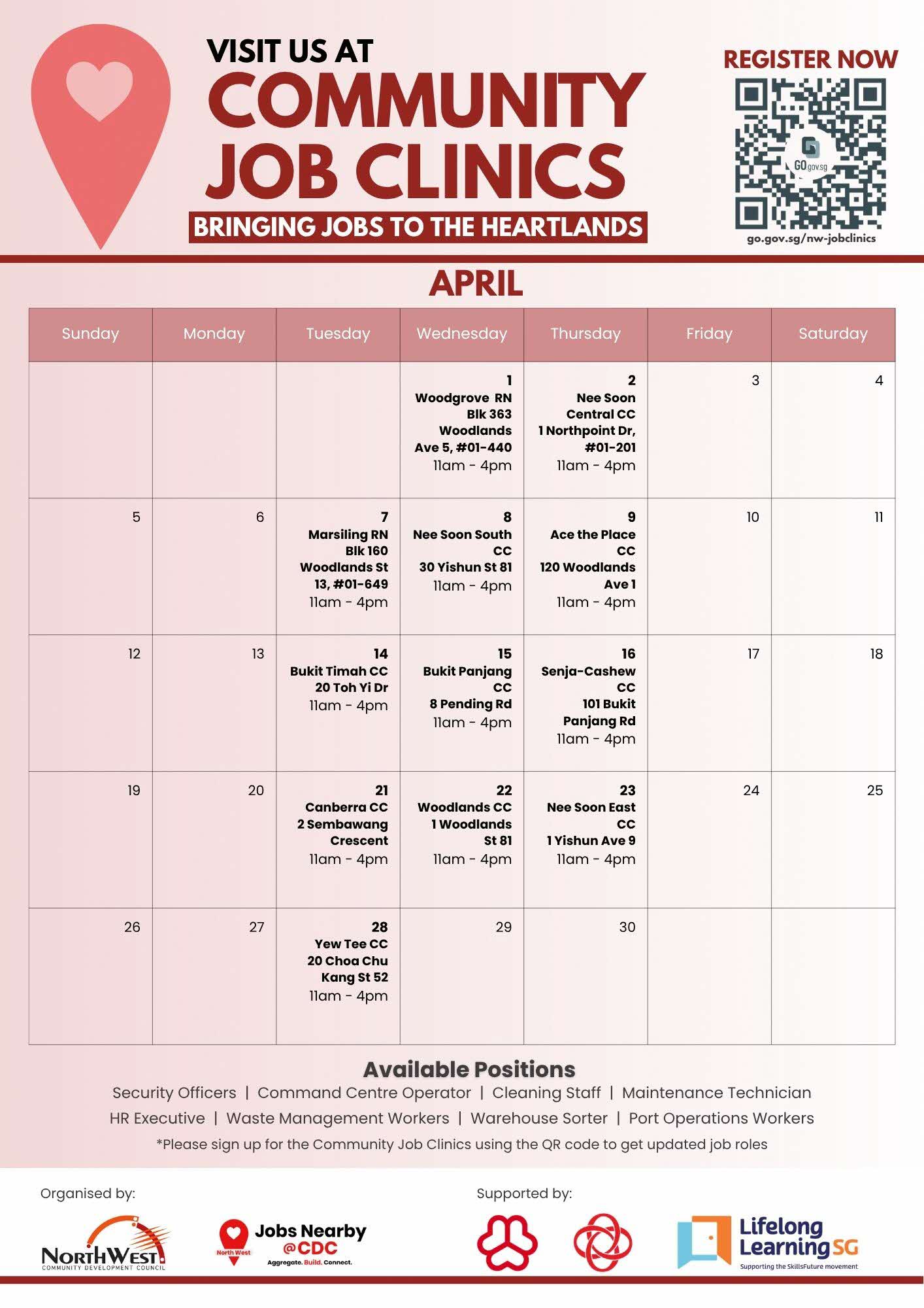 The job clinics are now right within your neighbourhood! Speak to our Job Ambassadors to discover available roles near you, and personalised career guidance between jobseekers and potential employers. Register your interest at go.gov.sg/nw-jobclinics.